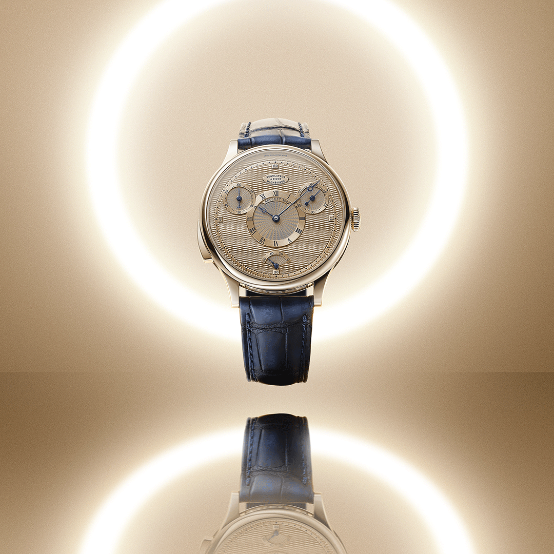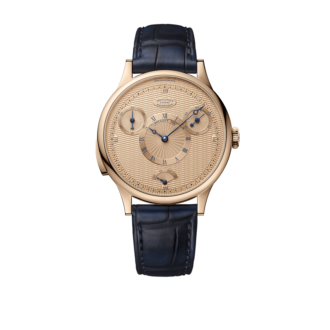 Inspired by the historic “No. 1176” pocket watch (1802-09), this timepiece brings high-chronometry into a modern wristwatch: a 10 Hz escapement paired with a magnetic-pivot balance system elevates performance to extraordinary levels. Encased in 18K Breguet gold, the 41 mm round case features the signature “Quai de l’Horloge” guilloché motif on the dial, case-band and inter-horn space. On the dial are two subsidiary seconds counters at 2 o’clock and 10 o’clock—the left one functioning as a resettable “observation” seconds for split timing.