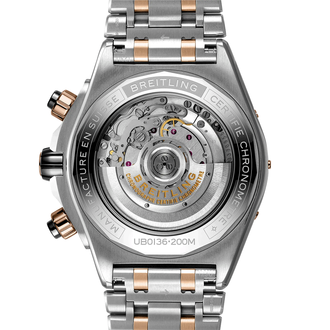 The Super Chronomat is inspired by the original 1980s Chronomat that Breitling created for the hotshots of aerobatic squadrons. The boldest of all Chronomat watches, the Super Chronomat features several ceramic inserts – on the bezel, on the chronograph pushers and on the crown – as well as a Rouleaux-inspired rubber strap. Still, this all-purpose sports watch won’t get in the way of your sense of style. The Super Chronomat comes in several colour and metal variations, from stainless steel to 18 k red gold. It either features the iconic Rouleaux bracelet or a rubber Rouleaux-inspired strap, matched with a folding clasp. The Super Chronomat B01 44 is powered by the Breitling Manufacture Calibre 01, a COSC-certified chronometer.