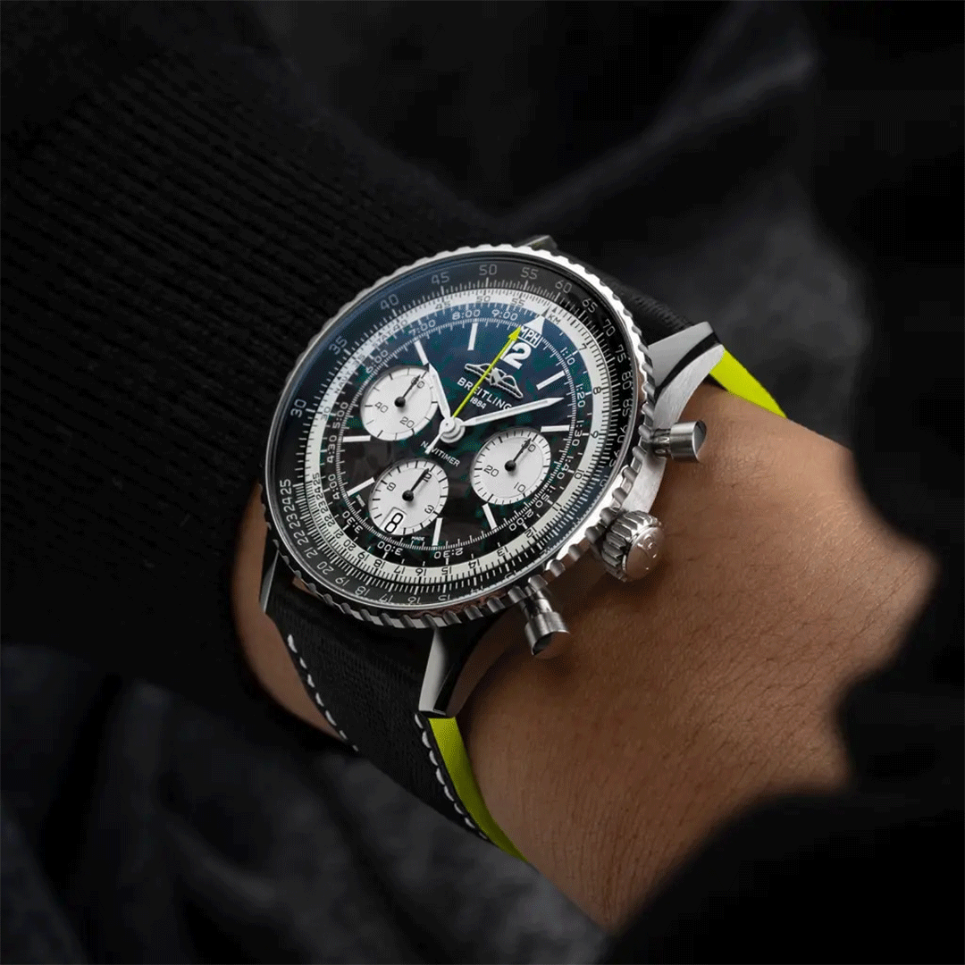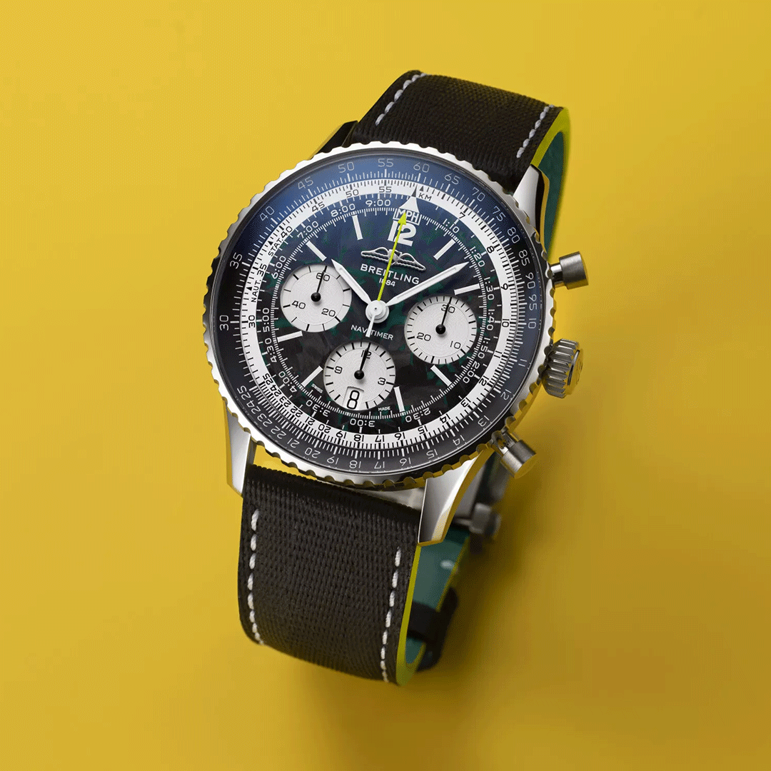 From its carbon-fiber dial and lightweight titanium case to details inspired by the cockpit of an F1 car, every element is designed for absolute timing accuracy under pressure. Turning the watch over reveals its engine, the Breitling Manufacture Caliber 01, fitted with a specially developed matte-black rotor bearing the Aston Martin Aramco logo. Originally developed as a pilot’s instrument, with a circular slide rule for real-time calculations, the Navitimer made its way from sky to circuit, worn by drivers who demanded the same precision on the track.