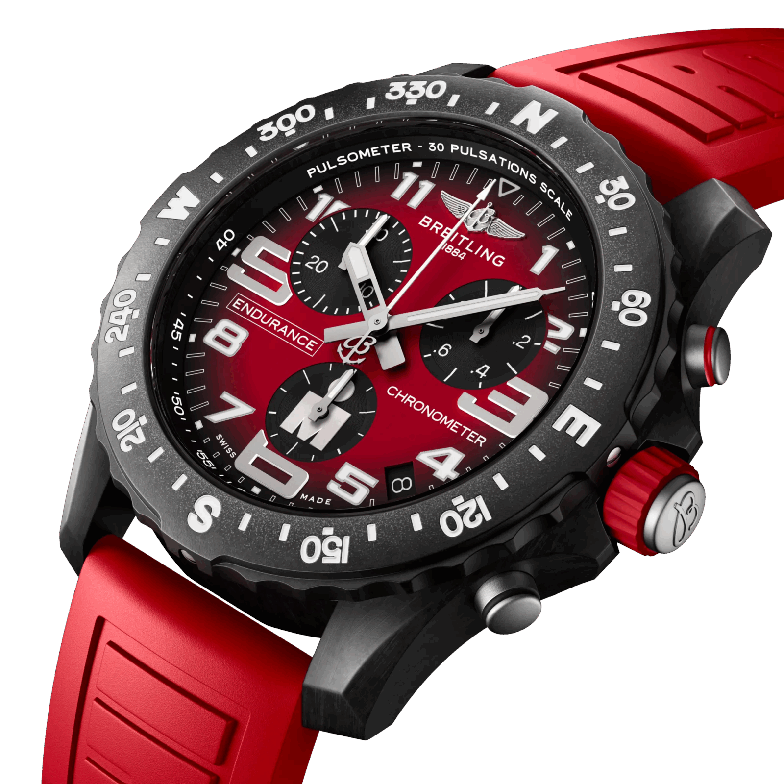 Designed for men and women whose active lives blend a professional mindset with a sporty lifestyle, the Endurance Pro 44 IRONMAN® is equal to the challenges of a rigorous workout yet stylish enough for everyday wear. It features an ultra-light Breitlight® case: 3.3 times lighter than titanium and 5.8 times lighter than stainless steel. Non-magnetic, thermally stable, hypoallergenic, with high resistance to scratches, corrosion and mechanical traction. The red-themed dial and rubber strap reflect its IRONMAN® collaboration, while the COSC-certified SuperQuartz™ movement ensures high precision.