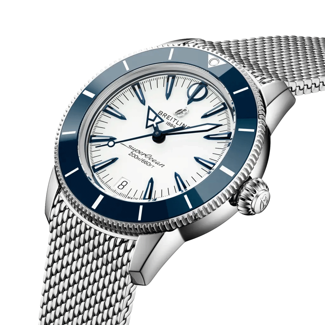 The Superocean Heritage Automatic 36 reflects Breitling’s original 1957 dive watch philosophy, combining vintage-inspired aesthetics with modern engineering. Its stainless steel case and integrated metal bracelet deliver both durability and refined comfort, while the ceramic-inlayed bezel enhances scratch resistance for everyday wear.
