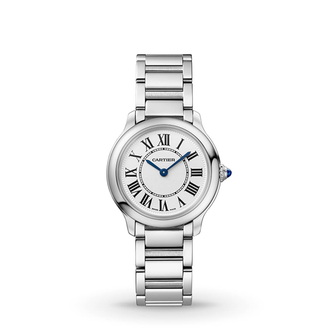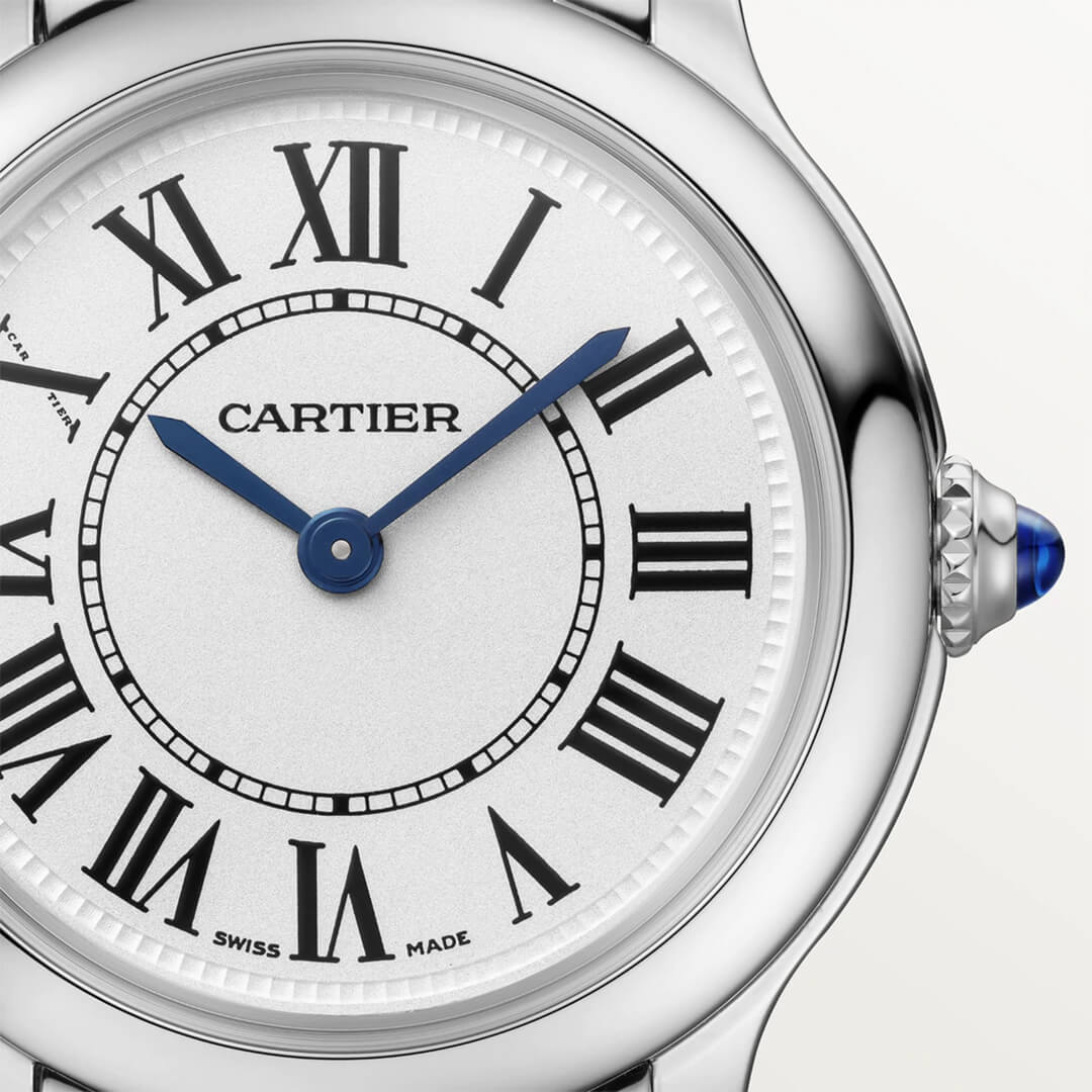Roman numerals, blue apple-shaped hands, winding mechanism crowned with a sapphire and rail-track minute circle: the Ronde Louis Cartier watch is a classic timepiece by Cartier.