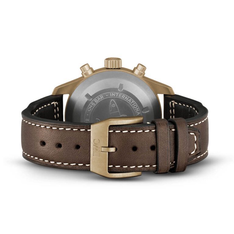 The IWC-manufactured 69380 calibre is a rugged chronograph movement with a classic column wheel design. It displays stopped hours and minutes in two subdials at “9 o’clock” and “12 o’clock”. The bidirectional pawl-winding system builds up a power reserve of 46 hours.
