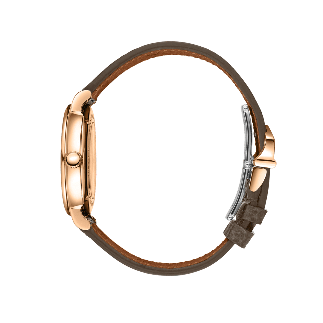 Powered by the automatic calibre 35180, the watch delivers a dependable 50 hour power reserve, while the convex sapphire crystal ensures clarity from every angle. Water resistance to 5 bar and a refined leather strap complete a design that blends everyday wearability with quiet sophistication.