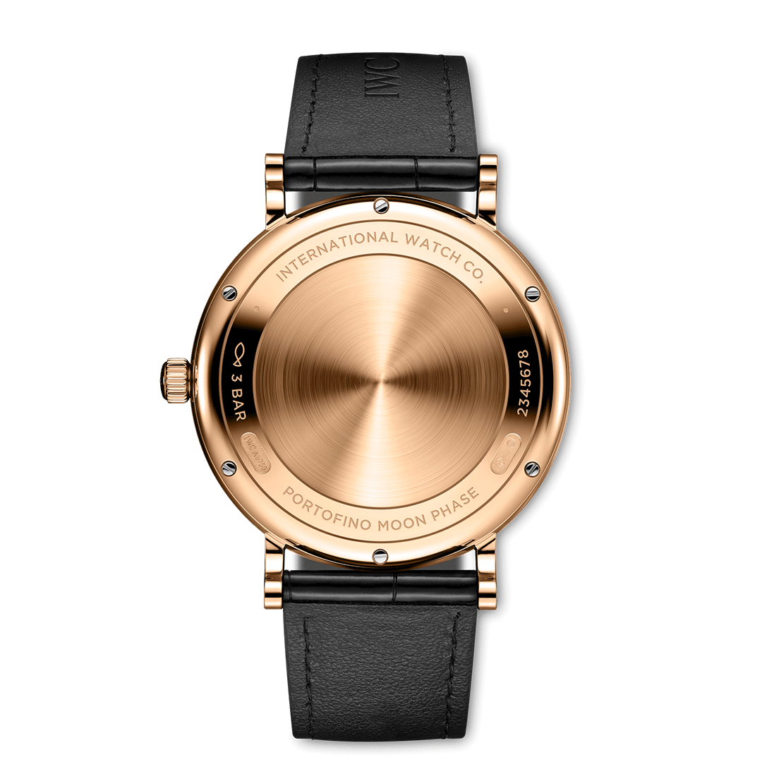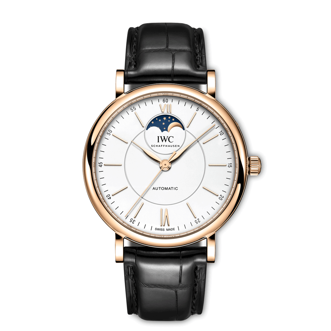IW459403Portofino CollectionThe Portofino Automatic Moon Phase features an 18-carat 5N gold case, a silver-plated dial with gold-plated hands and a black alligator leather strap.