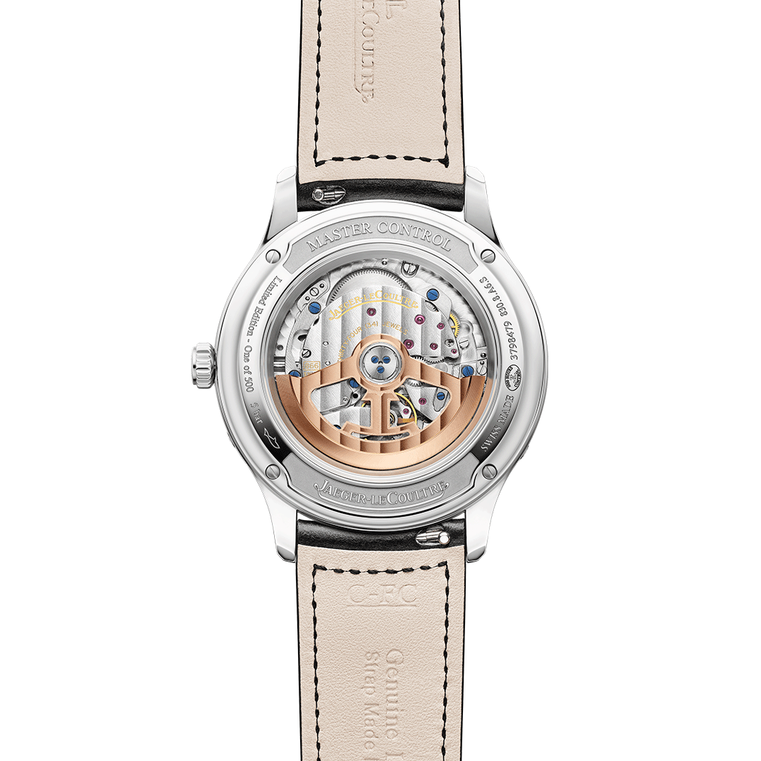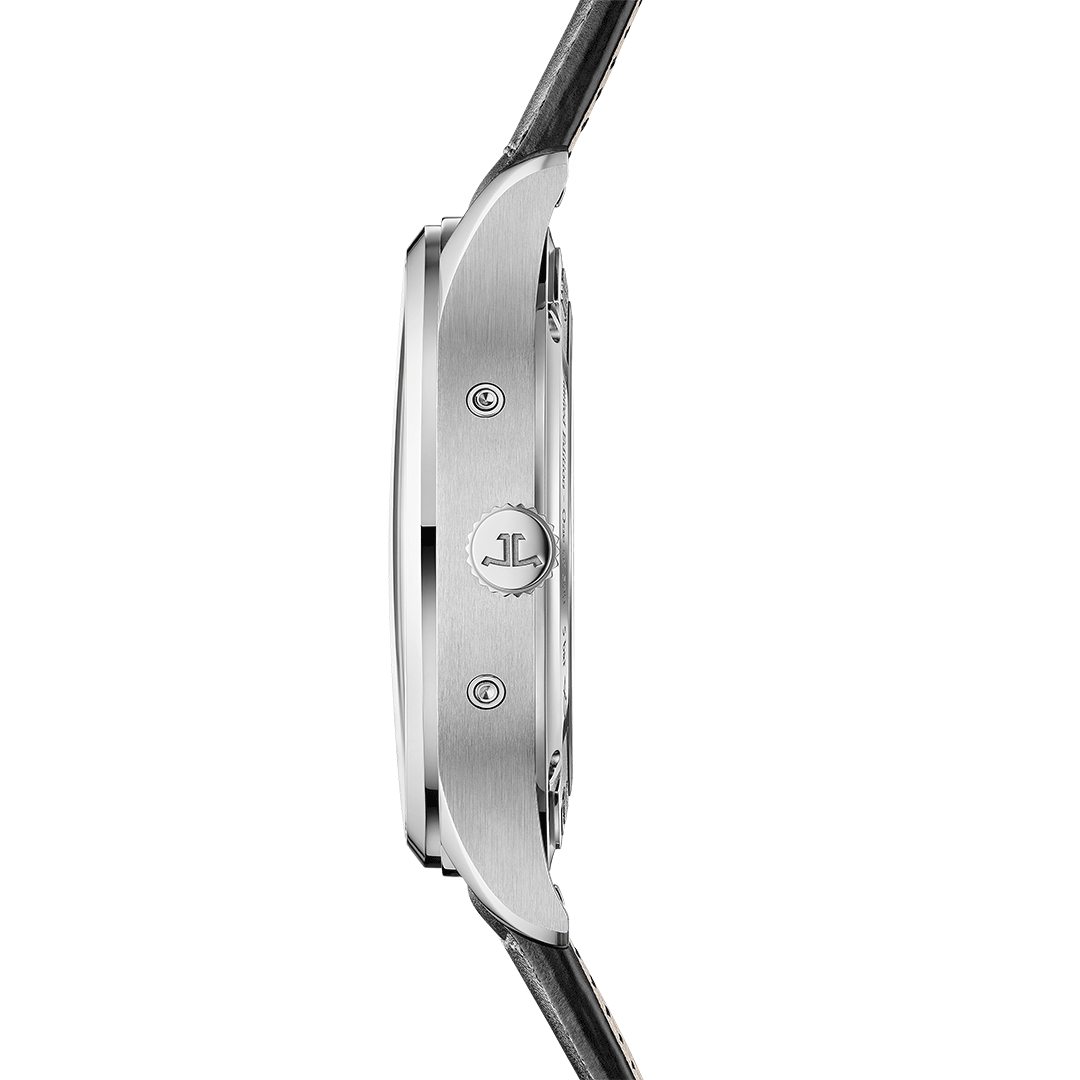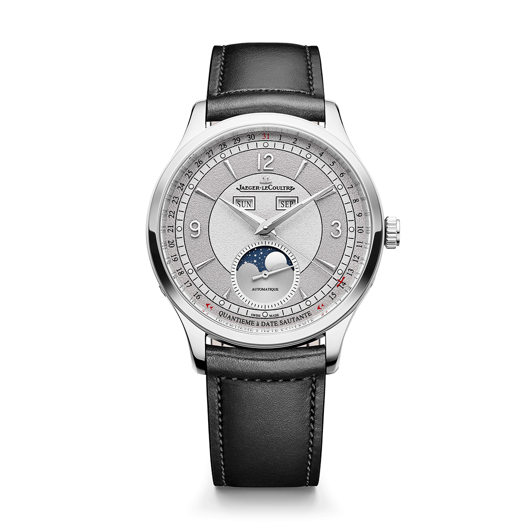 Q4148450Master ControlOn the 2025 Master Control Calendar limited edition, the finish of the dial catches the eye with its elegant interplay of textures and tones: a refined grained surface alternates between two shades of grey arranged in concentric rings, lending depth and sophistication to the display.