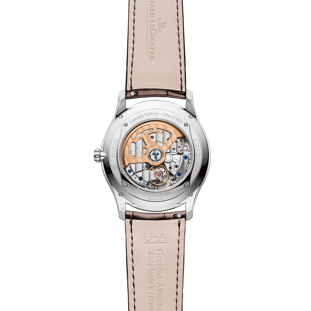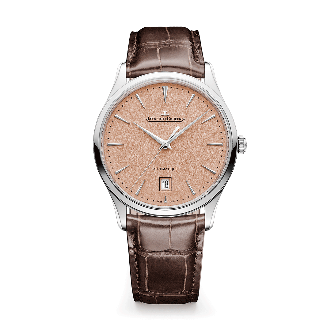 Q1238460Master Ultra ThinThe Master Ultra Thin Date embodies refined elegance in a 39mm steel case, a mere 7.8mm in profile. Its copper-toned, grained dial presents a study in balanced symmetry, with a date display subtly positioned at 6 o’clock.