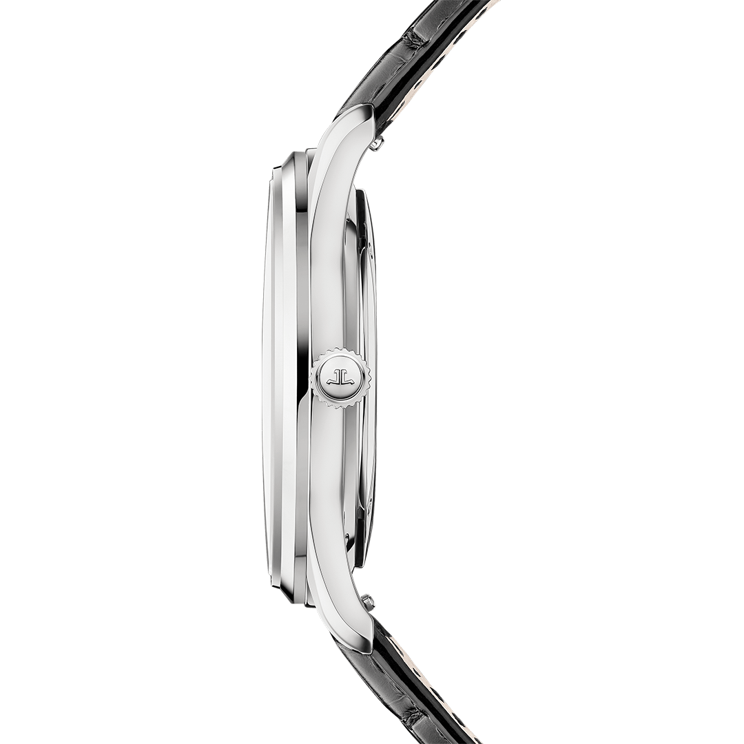 The well-balanced proportions and refined lugs on its polished steel case ensure an extremely comfortable fit. Its dial with a sunrayed silver background highlights the moon phase at noon, the Dauphine hands with their double satin-polish finish, the minute track dots, the elongated hour markers, the applied JL logo… On this perpetual calendar, the three counters display the date at 3 o’clock, the day of the week at 9 o’clock and the month at 6 o’clock.