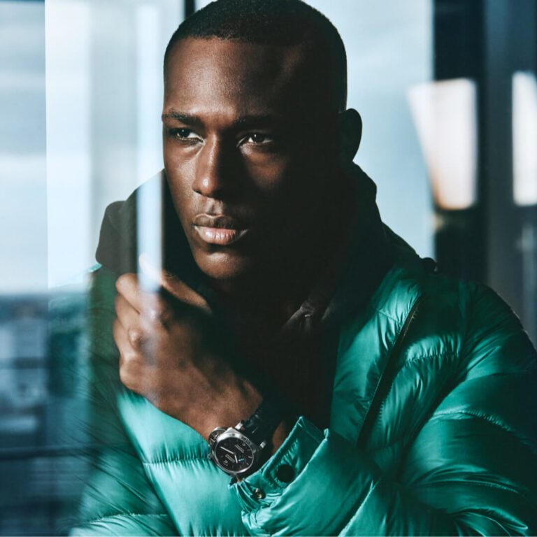 Black with luminous Arabic numerals and hour markers. Date at 3 o’clock and small seconds at 9 o’clock