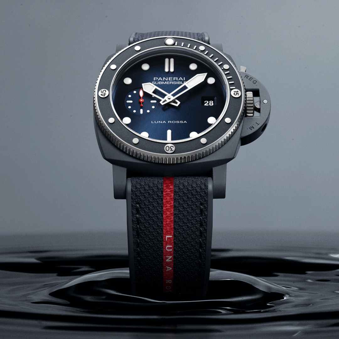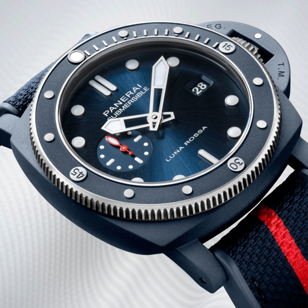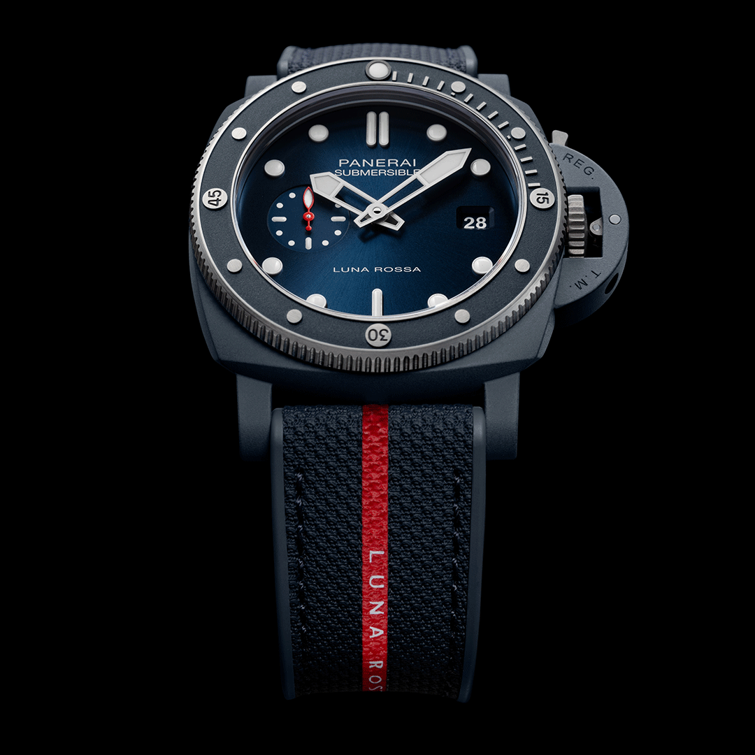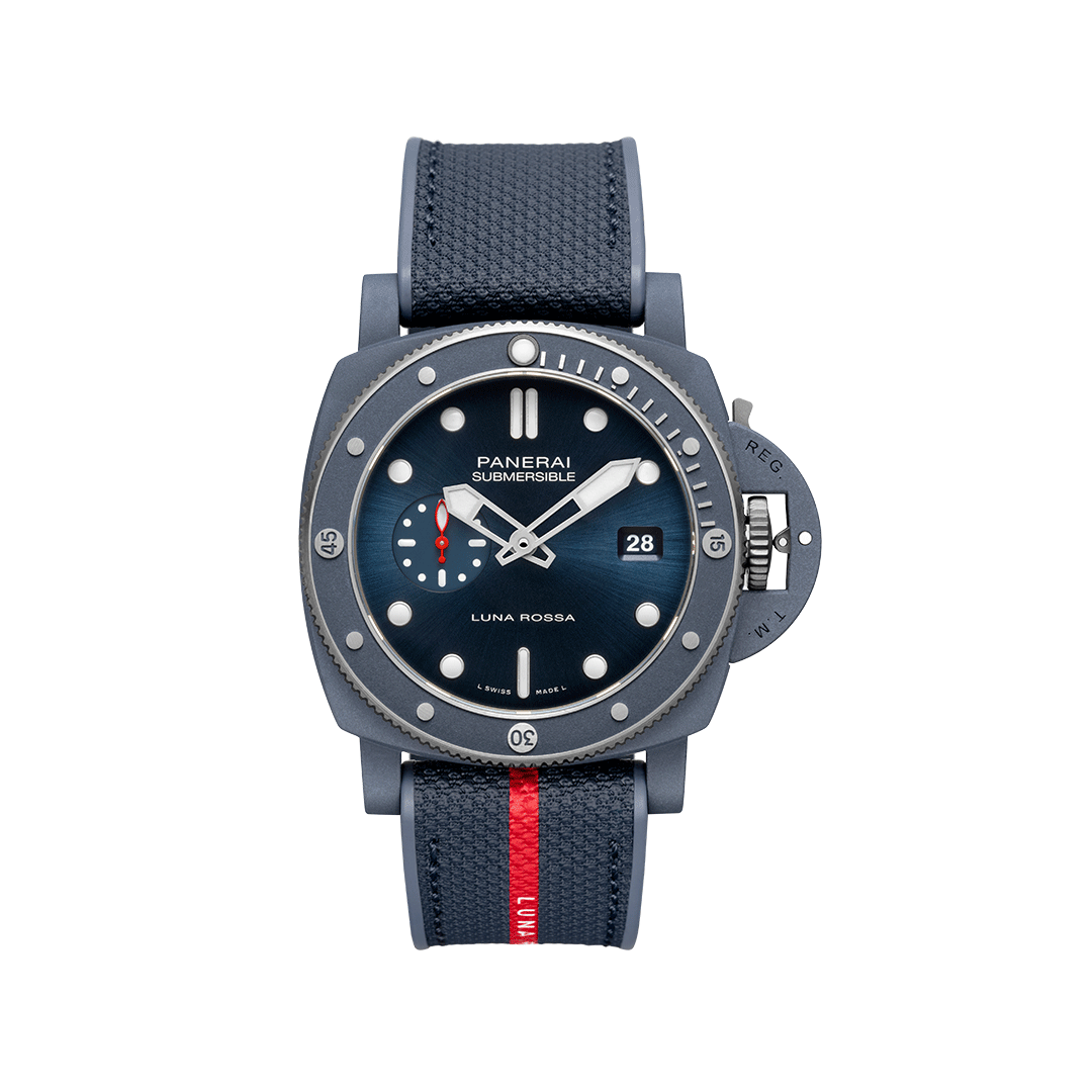 The Panerai Submersible QuarantaQuattro Luna Rossa PAM01466 is a bold dive watch that combines Panerai’s seafaring heritage with cutting-edge material innovation. Introduced in 2024, it debuts the Ti-Ceramitech™ case, which is lighter and stronger than traditional titanium while offering a distinctive blue finish. Powered by the automatic P.900 calibre, it delivers reliable precision and a three-day power reserve. The watch is paired with a Luna Rossa bi-material strap for a sporty and technical look.