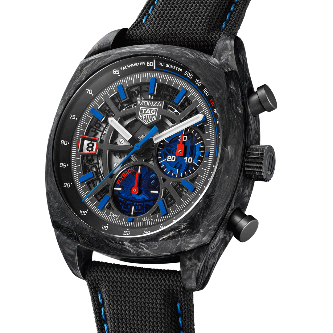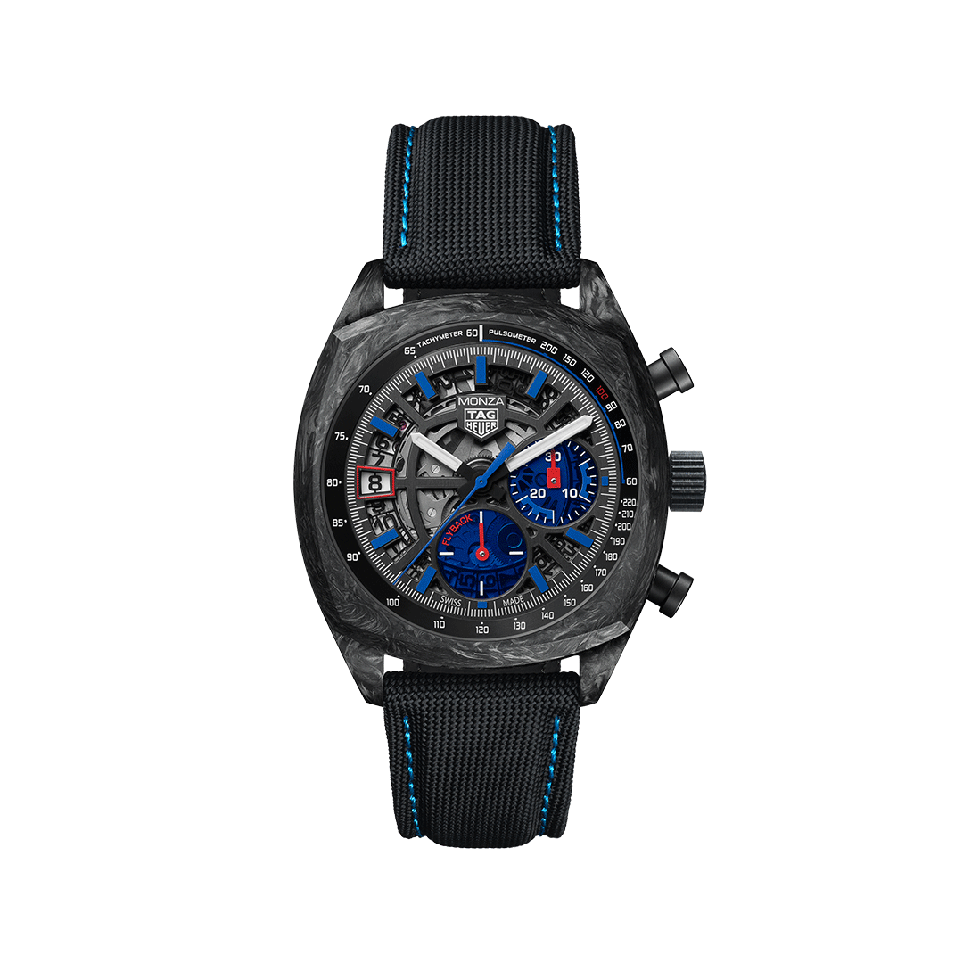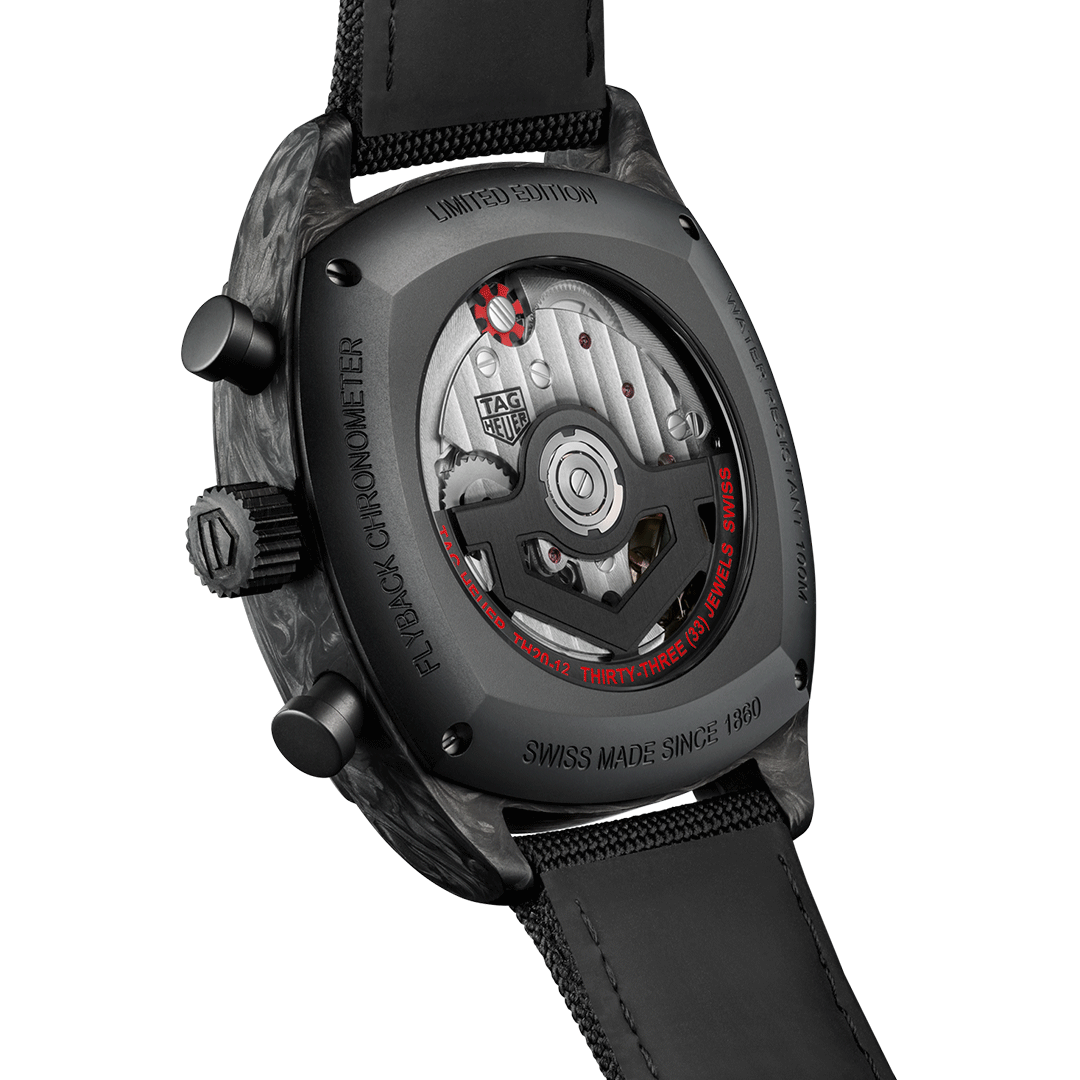 Monza returns in a contemporary tribute to the indelible link between TAG Heuer and competition motorsport: this striking carbon rendition with an extreme sports look embodies the very essence of the Maison. The 42-mm case, made of ultra-lightweight and resistant carbon, is powered by the Manufacture Calibre TH20-12 Flyback, a chronograph movement with COSC certification. A watchmaking statement.
