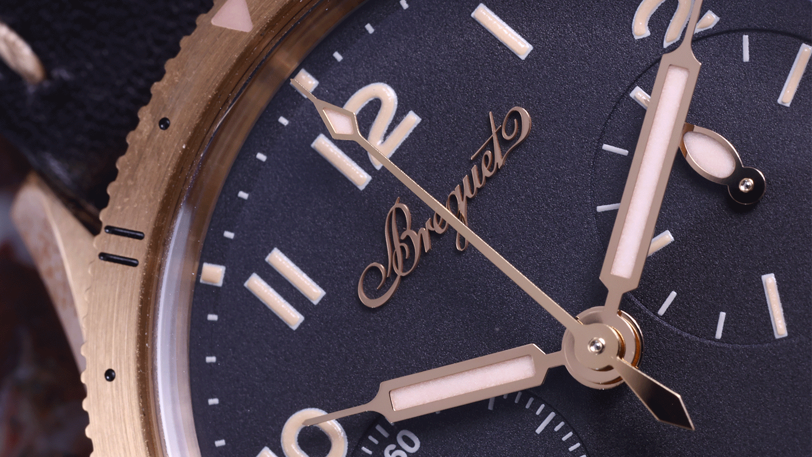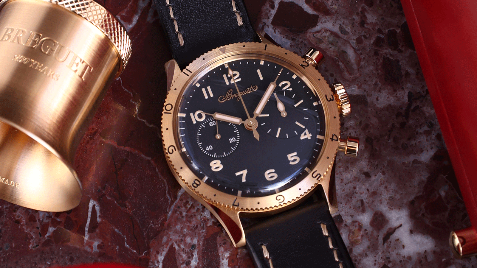 Its 38.3 mm case in Breguet gold recalls the compact proportions of the originals, while the black anodised aluminium dial evokes the aesthetic of aviation instruments, bold Arabic numerals, luminous paint, and a bi-directional rotating bezel ensuring clarity and control. The absence of a date window keeps the layout pure and symmetrical, amplifying its vintage allure.
