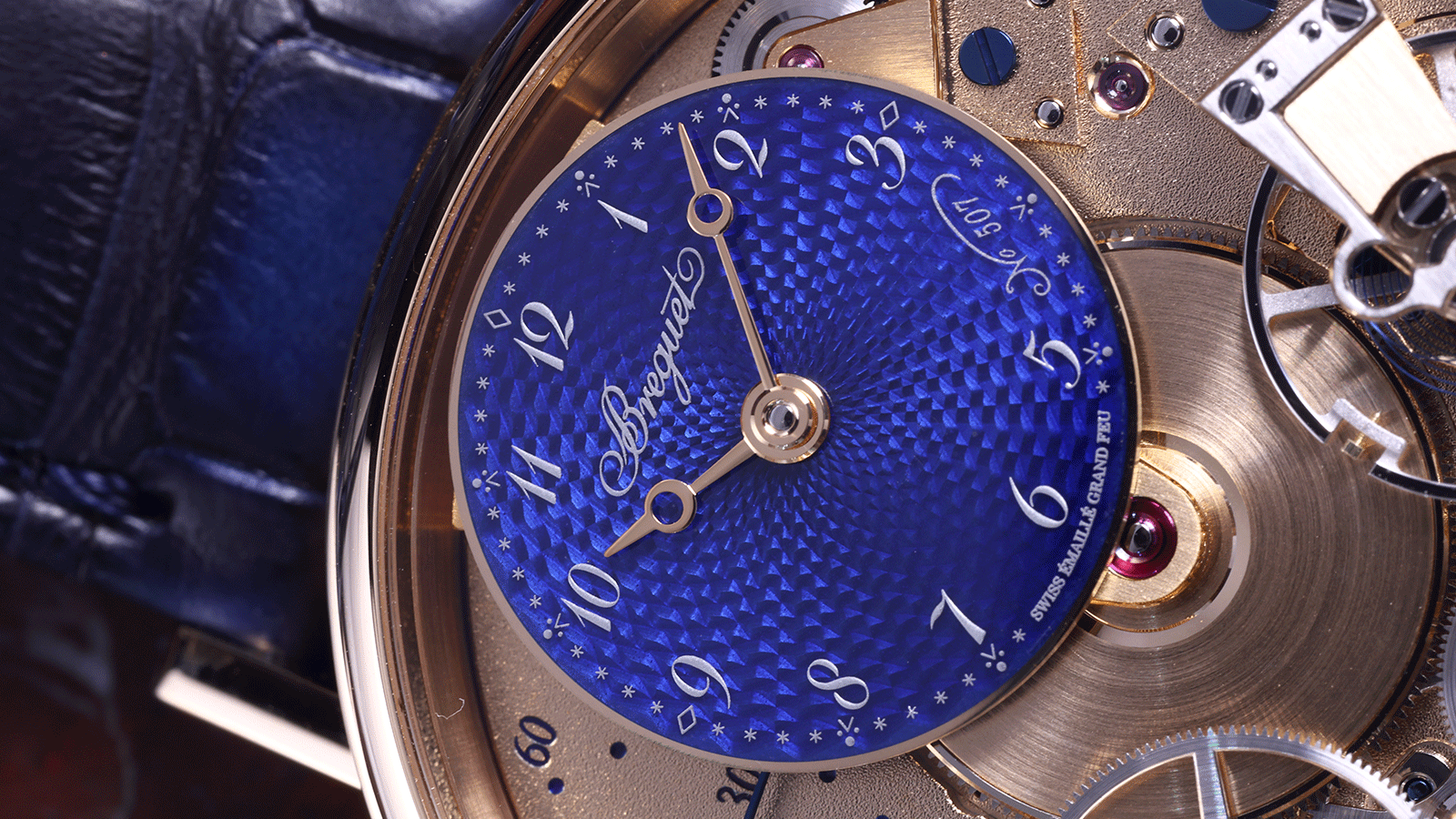 Crafted in 18 K Breguet gold, the 38 mm case frames a stunning hand-engine-turned dial, layered with translucent blue Grand Feu enamel that shimmers over the movement beneath. The off-centred hours and minutes at 12 o’clock are balanced by a retrograde seconds display, a technical flourish that animates the dial with rhythmic motion.