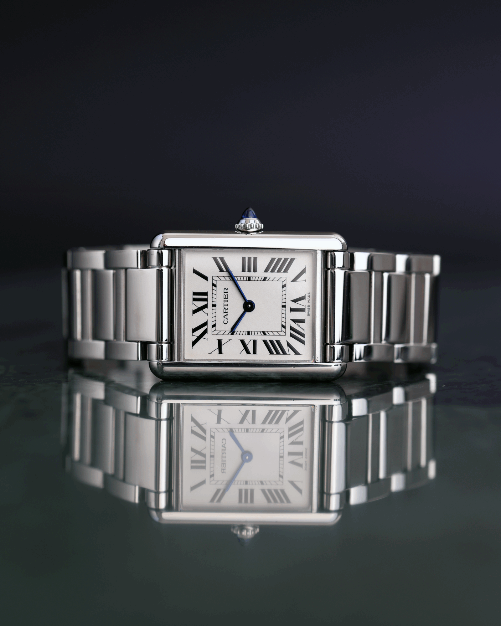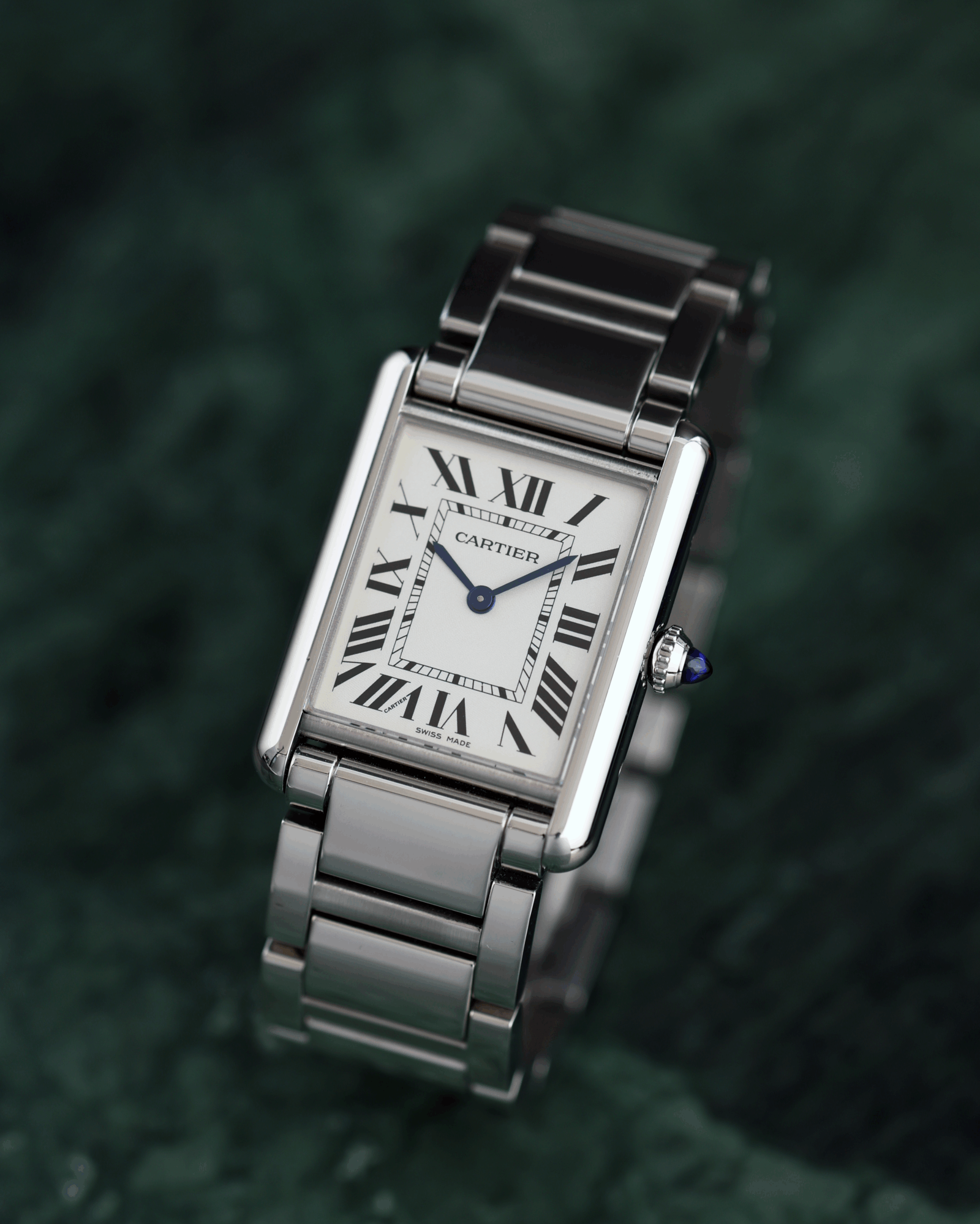 Tank Must watch, large model, photovoltaic SolarBeat™ movement. Steel case, beaded crown set with a synthetic cabochon-shaped spinel, silvered dial, blued-steel sword-shaped hands, steel bracelet, folding buckle. Case dimensions: 33.7 x 25.5 mm, thickness: 6.6 mm. Water-resistant up to 3 bar (approx. 30 meters/100 feet).