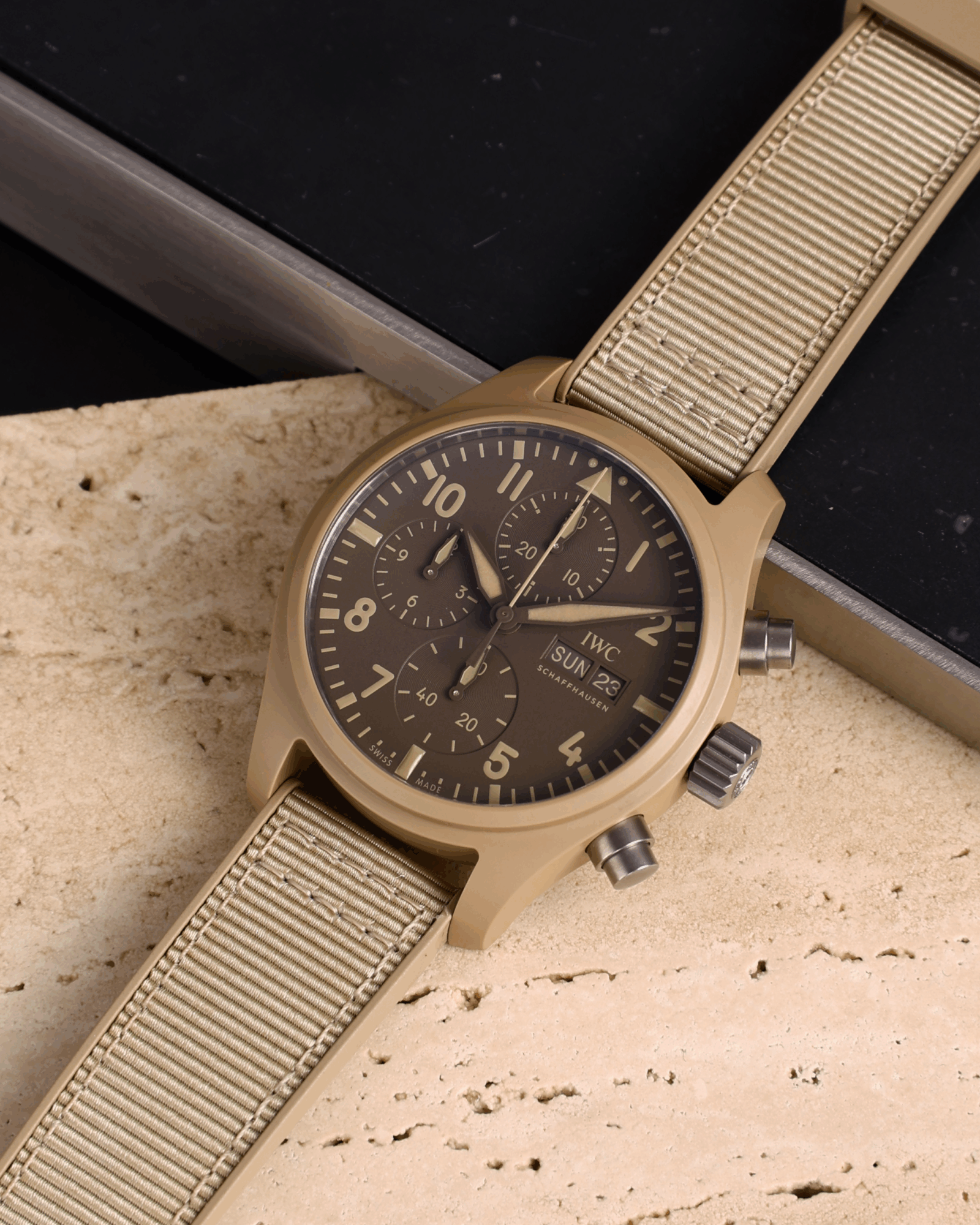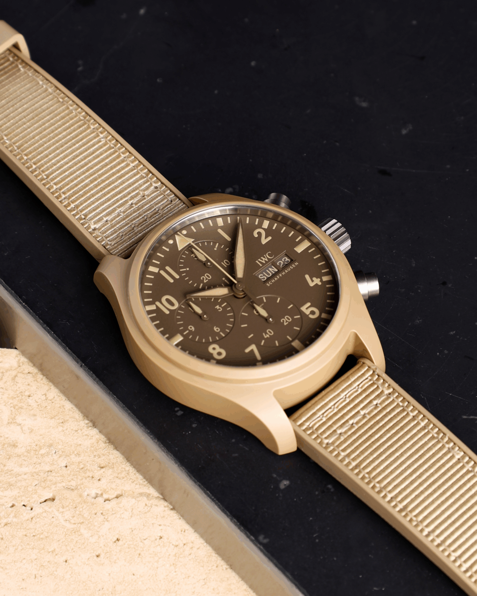 IW389402IWC SchaffhausenThe Pilot’s Watch Chronograph 41 TOP GUN Mojave Desert features an ergonomic 41-millimetre case made of sand-colored ceramic and a striking monochromatic design.