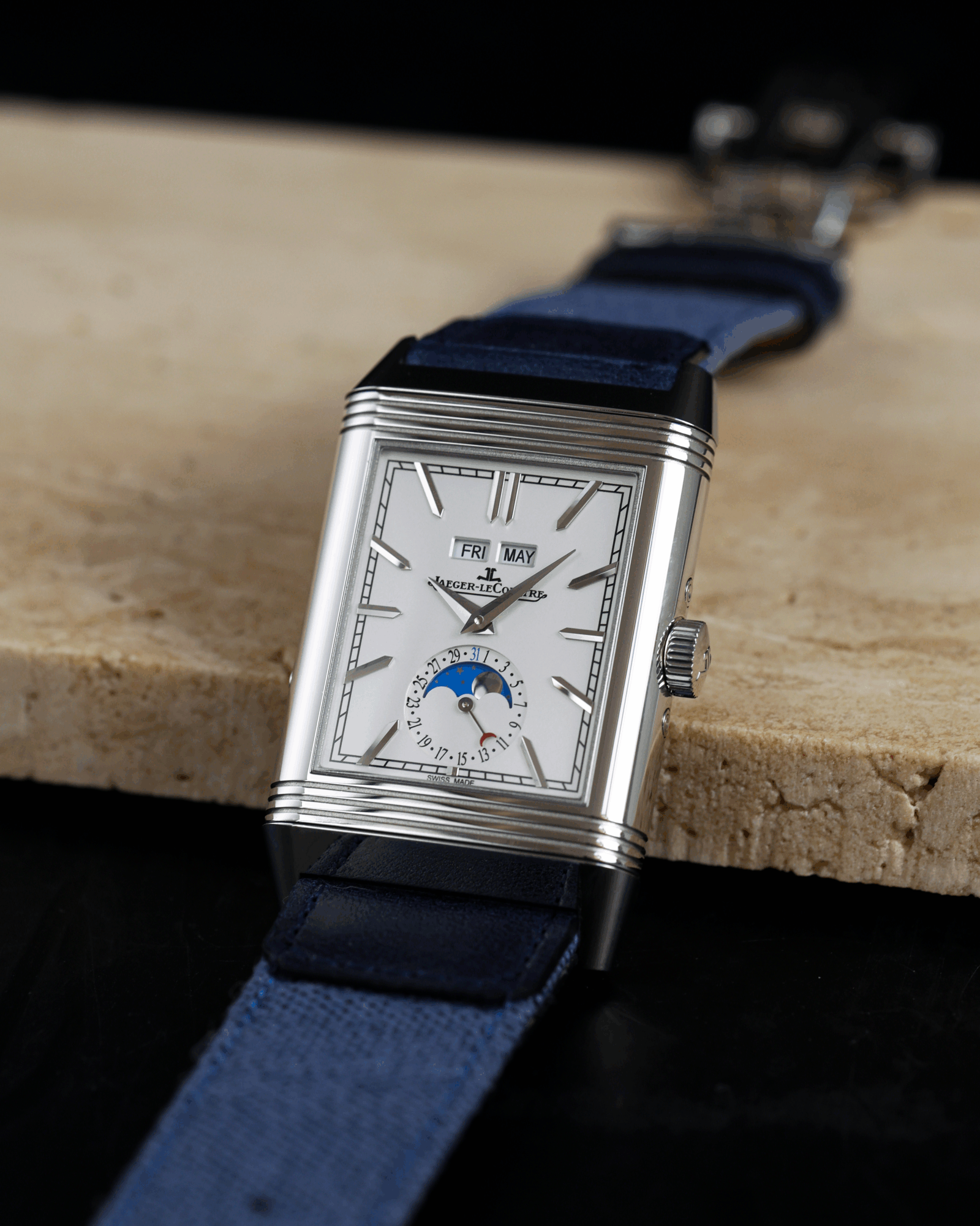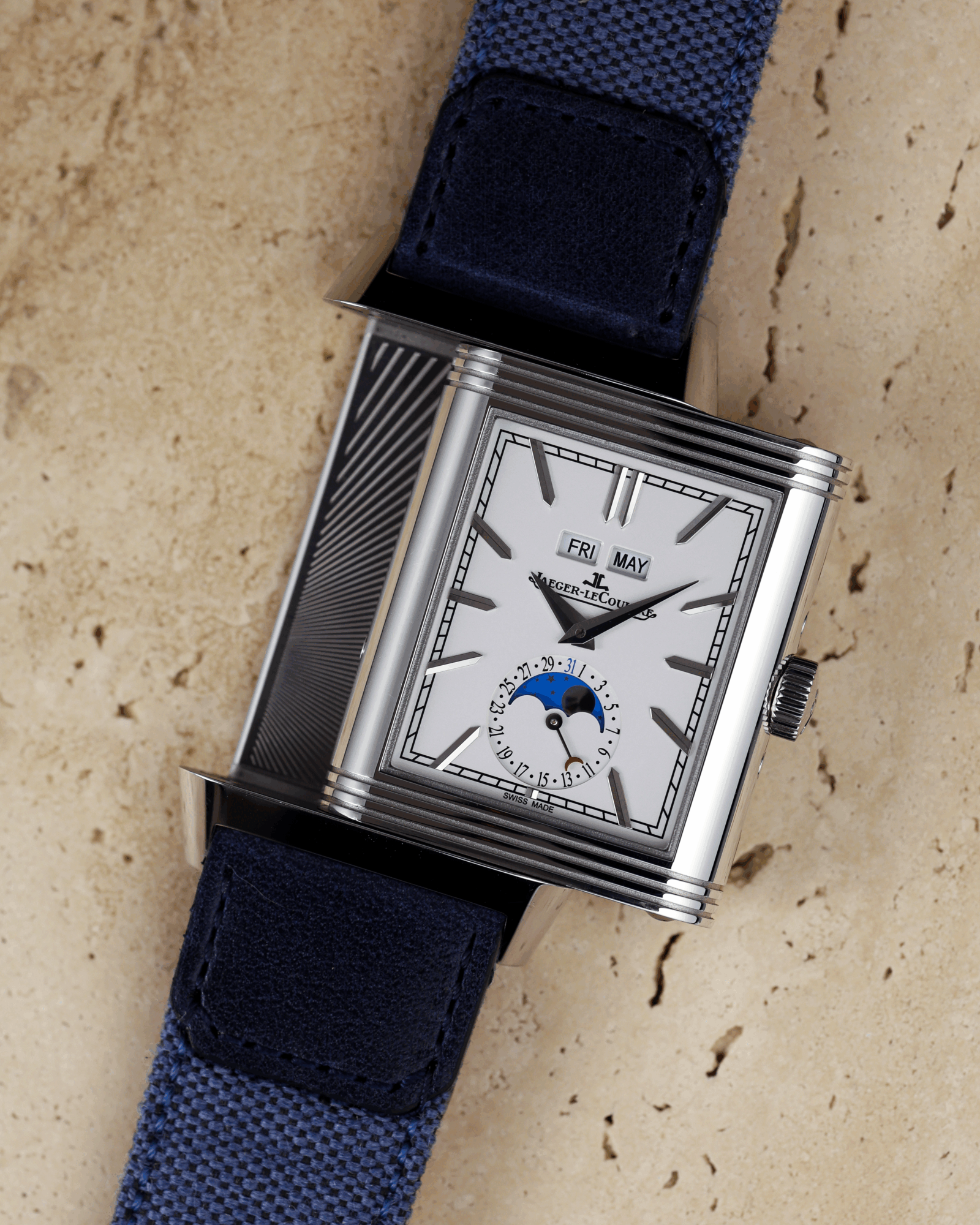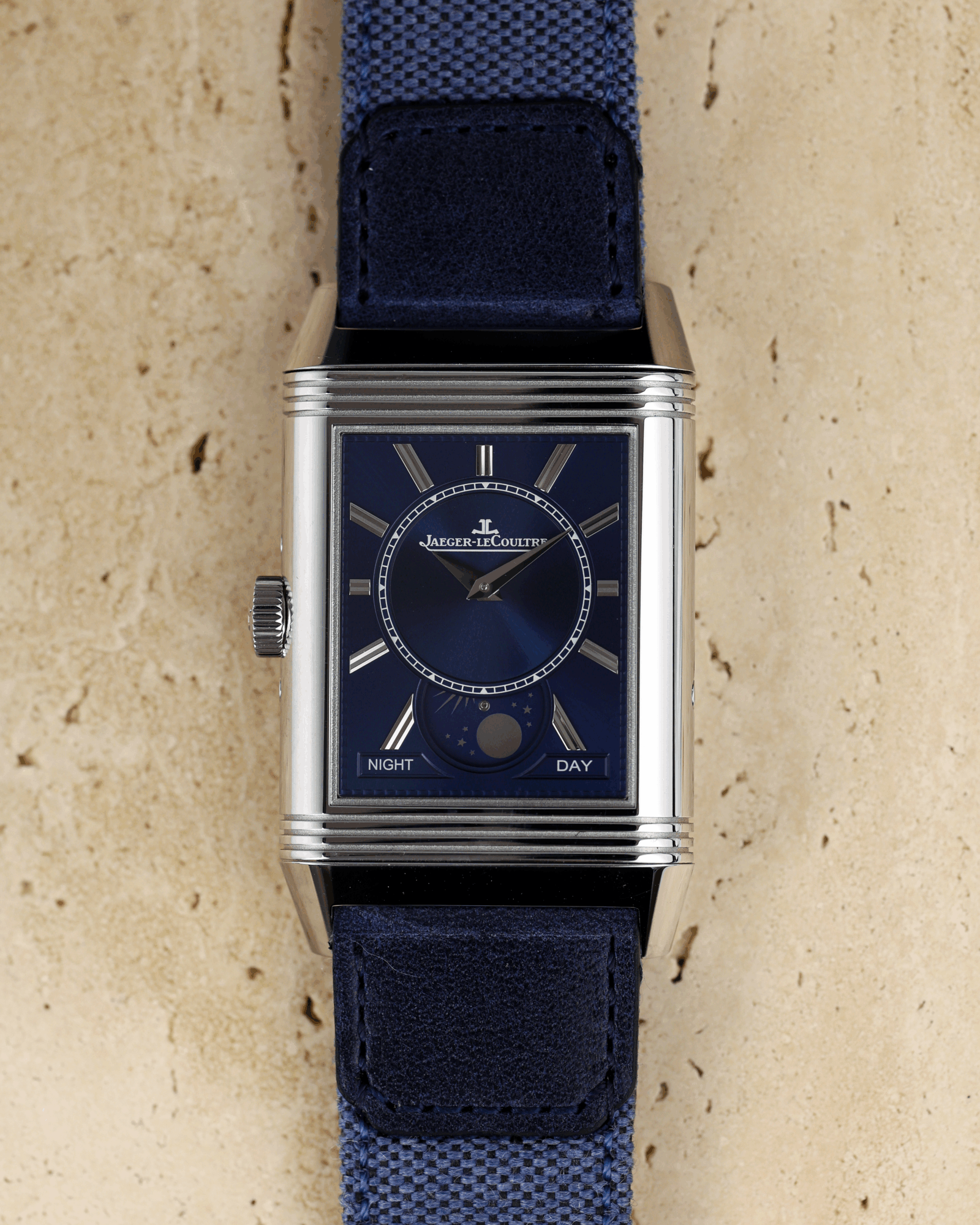 On the deep blue sunray dial, the double hour-markers surrounding the minute track form an elegant decoration in which a new Night/Day disc is set. The Reverso Tribute Duoface Calendar comes with two easily interchangeable bracelets with a strong vintage character.