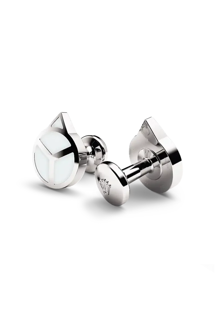 These cufflinks bring together several signature elements of Rolex watches. In the centre, the five-pointed crown is engraved on a Cerachrom disc in ceramic, which is surrounded by fluting that evokes the emblematic bezel seen on Classic Rolex models.