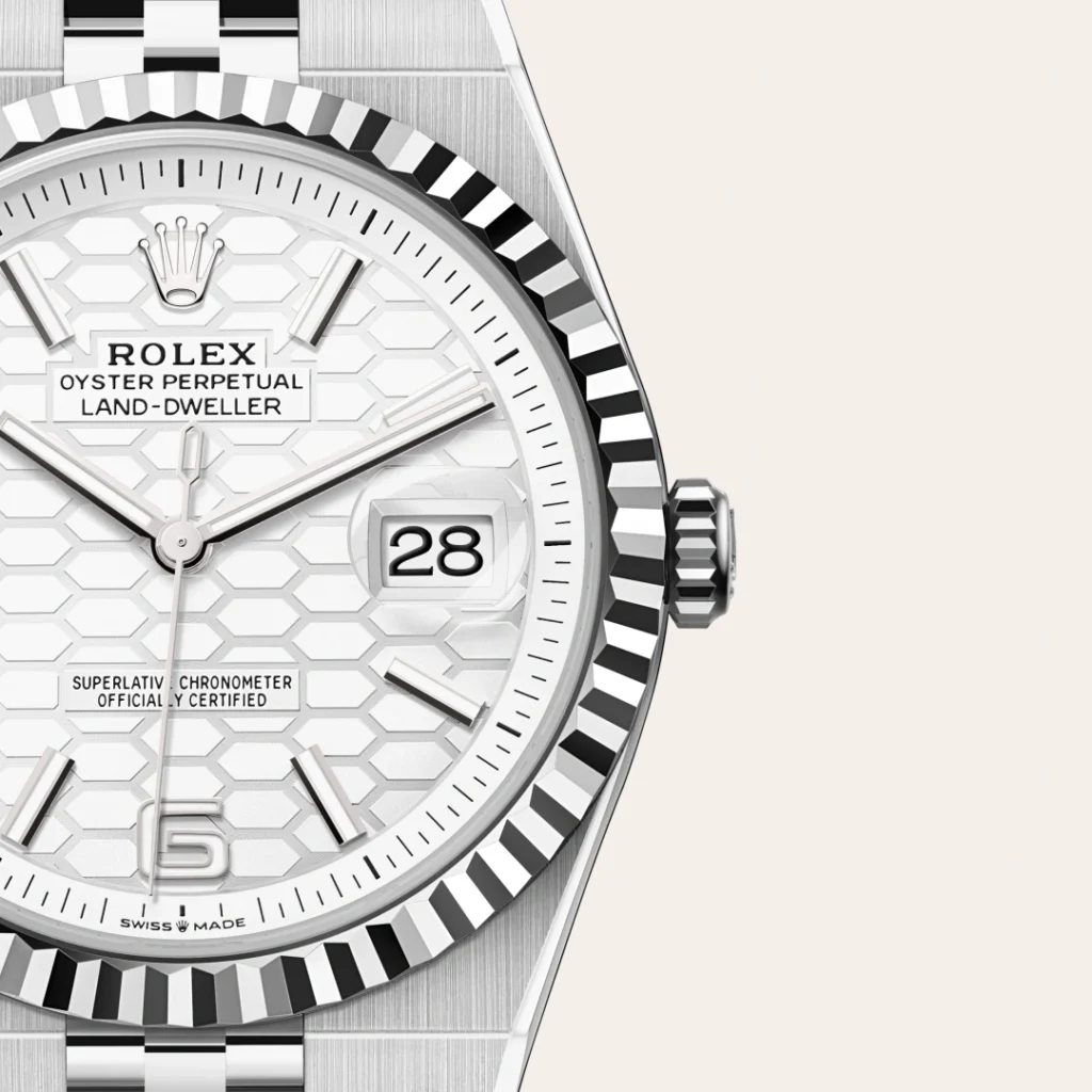The Rolex fluted bezel is a mark of distinction. Originally, the fluting of the Oyster bezel had a functional purpose: it served to screw the bezel onto the case helping to ensure the waterproofness of the watch. It was therefore identical to the fluting on the case back, which was also screwed onto the case for waterproofness, using specific Rolex tools. Over time, the fluting became an aesthetic element, a genuine Rolex signature feature. Today the fluted bezel is a mark of distinction, in gold on this Land-Dweller 40.